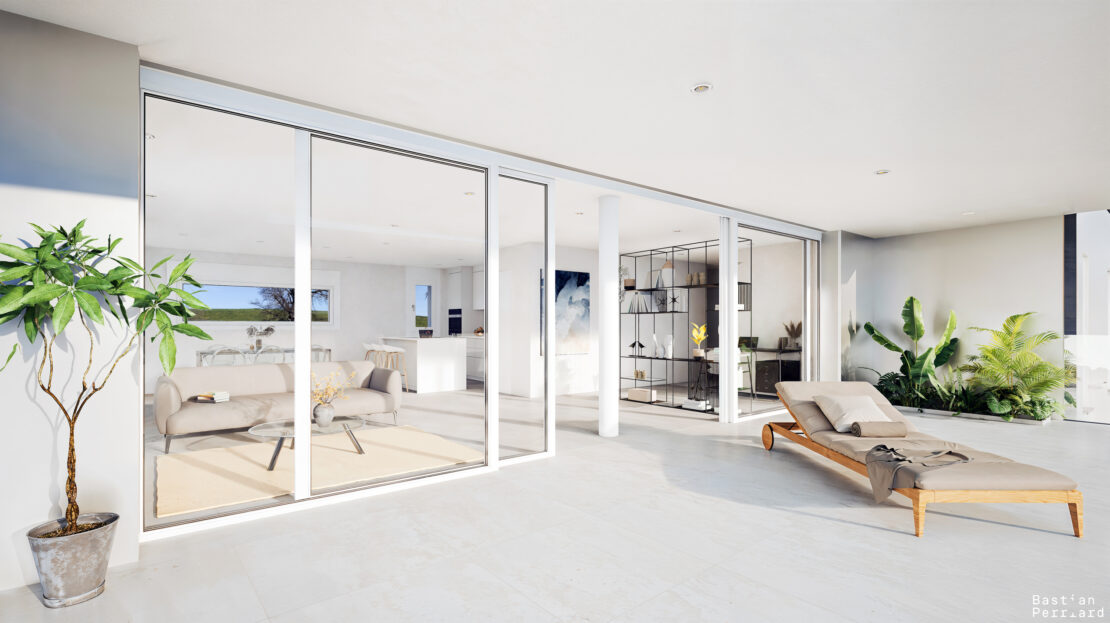 – Cuisine et séjour de 53.10 m2 avec accès sur la terrasse couverte de 30.60 m2